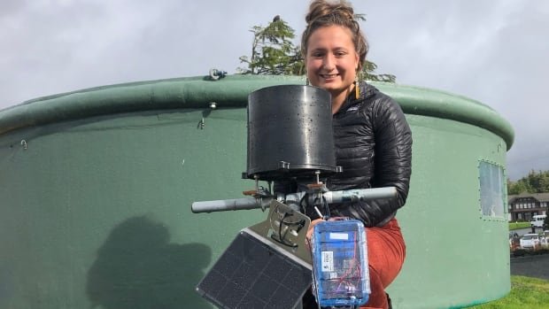 Zofia Danielson, a research co-ordinator at the Sitka Sound Science Center in Alaska, displays a rainfall monitoring bucket, which gathers information used to assess landslide risk. (Molly Segal/CBC)
